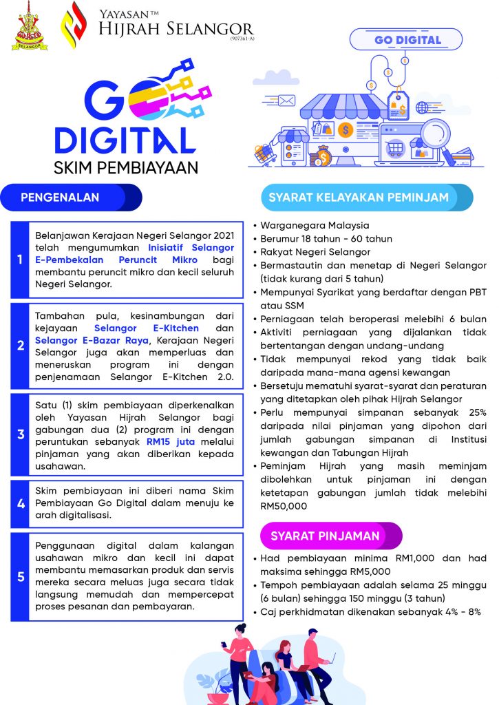 Hijrah Selangor menawarkan Skim Pembiayaan Go Digital bagi membolehkan usahawan meningkatkan prestasi perniagaan dengan menembusi ke arah digital.