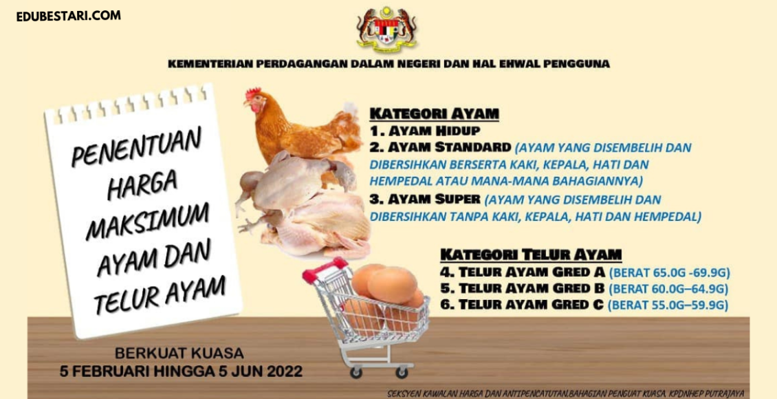 Harga maskimum ayam dan telur ayam yang ditetapkan oleh kerajaan ketika ini adalah berkuatkuasa sepanjang tempoh berikut:
