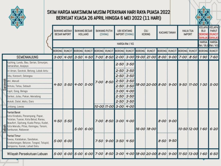 Pelaksanaan Skim Harga Maksimum Musim perayaan Hari Raya Puasa 2022 adalah sepanjang tempoh berikut: