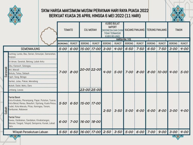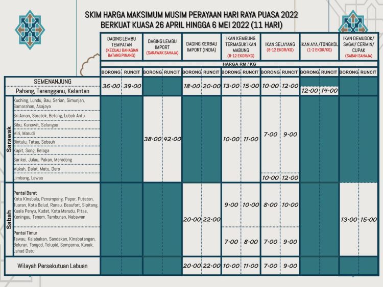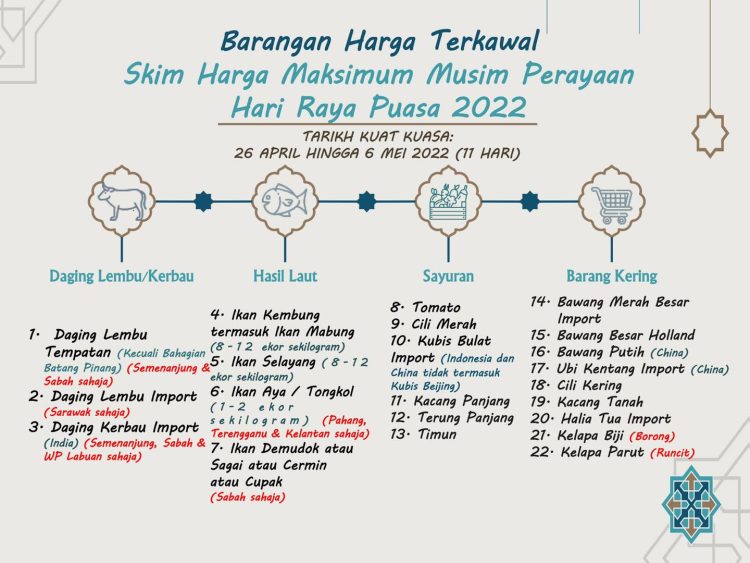 Pelaksanaan Skim Harga Maksimum Musim perayaan Hari Raya Puasa 2022 adalah sepanjang tempoh berikut: