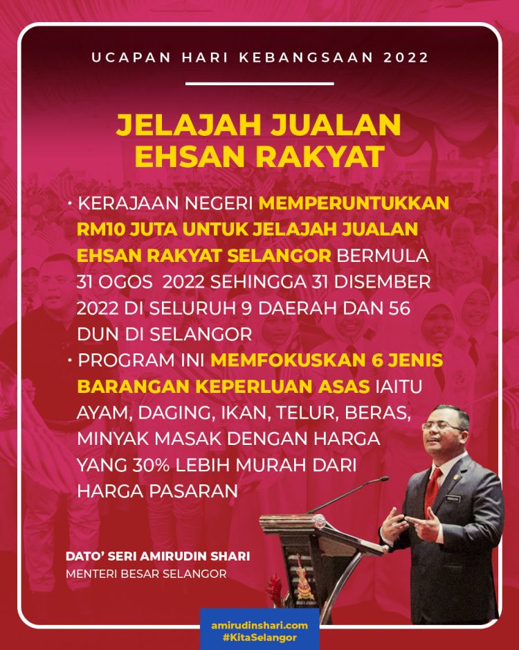 Kerajaan negeri turut mengumumkan peruntukan tambahan RM10 juta bagi melaksanakan Jualan Ehsan Rakyat Selangor bermula 31 Ogos sehingga 31 Disember depan di seluruh sembilan daerah dan 56 kawasan DUN di negeri ini.