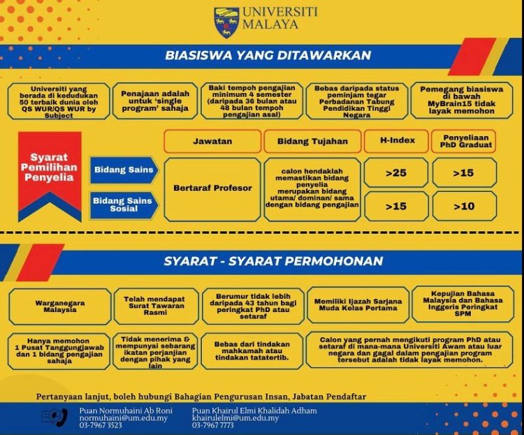 - Telah disahkan dalam perkhidmatan dan telah berkhidmat tidak kurang dari tiga (3) tahun di Universiti Malaya.