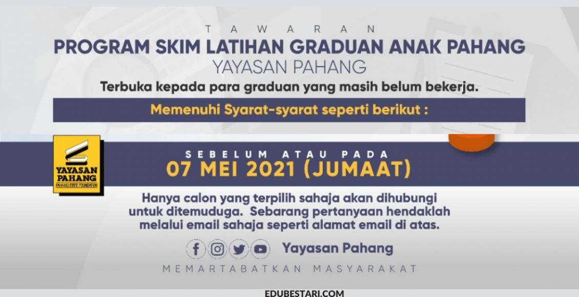 Sekiranya anda berminat dengan program latihan yang ditawarkan dan memenuhi kriteria di atas, anda boleh hantarkan resume kepada pihak Yayasan Pahang melalui email berikut: