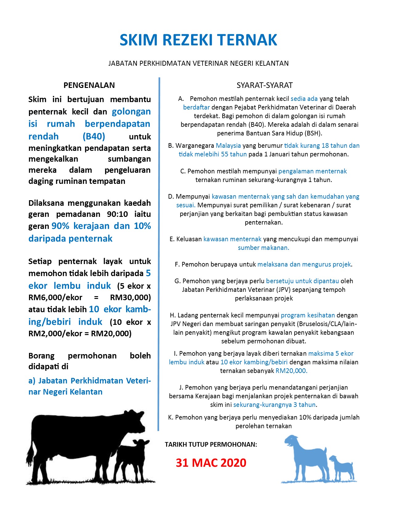 Skim Rezeki Ternak Untuk Penternak Baharu Golongan Berpendapatan Rendah (B40). Bantuan Sehingga RM30,000 Diberikan