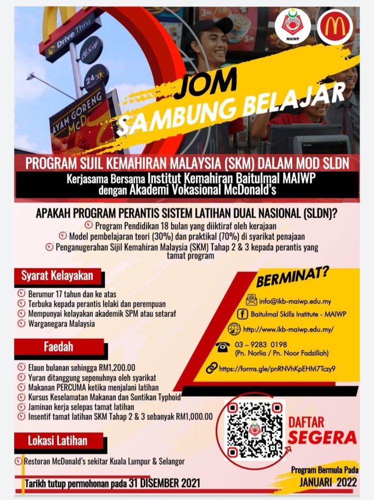 Peluang bina kerjaya buat lepasan SPM atau setaraf dengannya! Institut Kemahiran Baitumal MAIWP dengan Akademik Vokasional McDonald’s mempelawa individu yang berkelayakan sertai Program Sijil Kemahiran Malaysia (SKM) Dalam Mod SLDN. Program ini merupakan program pendidikan 18 bulan yang diiktiraf oleh kerajaan.