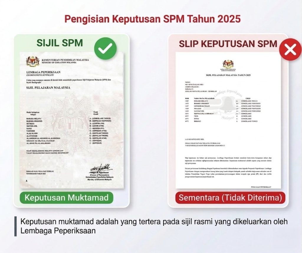 Kekeliruan paling biasa adalah antara slip keputusan SPM dan sijil SPM rasmi. Ramai beranggapan slip sudah mencukupi kerana ia memaparkan keputusan penuh peperiksaan. Hakikatnya, perkara ini boleh menyebabkan permohonan anda tidak sah tanpa disedari.