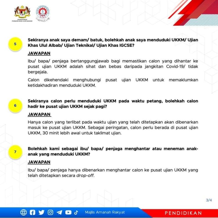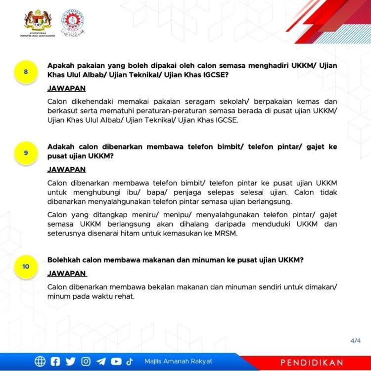 Untuk menjawab soalan yang anda sering tertanya-tanya berkenaan UKKM dan ujian khas kemasukan ke MRSM, anda boleh semak soalan-soalan lazim serta jawapannya di perkongsian bawah.
