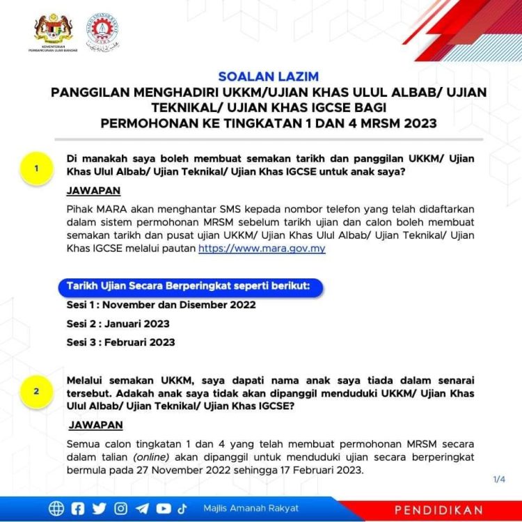 Soalan Lazim Panggilan Menghadiri UKKM/ Ujian Khas Kemasukan MRSM Tingkatan 1 & 4