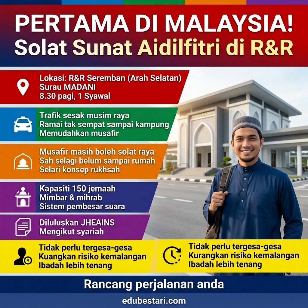 👉 Ini merupakan antara inisiatif pertama di Malaysia yang membolehkan solat sunat Aidilfitri dilakukan di kawasan R&R lebuh raya.