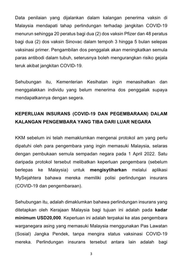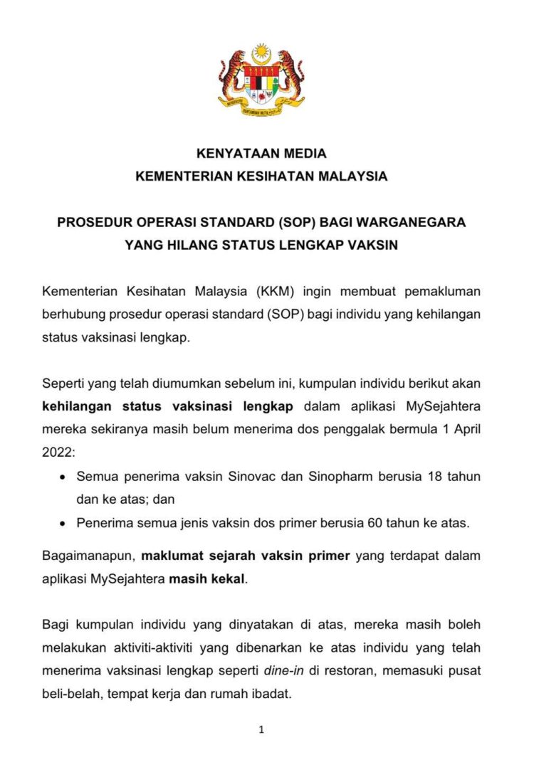 Bagi kumpulan yang hilang status lengkap vaksin, berikut adalah SOP yang dinyatakan oleh KKM: