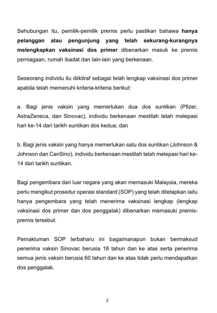 - Sehubungan itu, pemilik premis perlu pastikan bahawa hanya pelanggan atau pengunjung yang telah sekurang-kurangnya melengkapkan vaksinasi dos primer dibenarkan masuk ke premis perniagaan, rumah ibadat dan lain-lain yang berkenaan