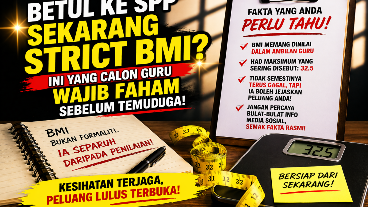 Ya, BMI memang menjadi antara faktor penting dalam ambilan guru SPP/KPM terkini. Had BMI sekitar 32.5 sering disebut dalam konteks pengambilan semasa. Namun, dakwaan seperti “terus gagal interview” atau “wajib timbang di tempat temuduga” lebih banyak datang daripada pengalaman calon, bukan garis panduan rasmi yang disahkan secara menyeluruh.