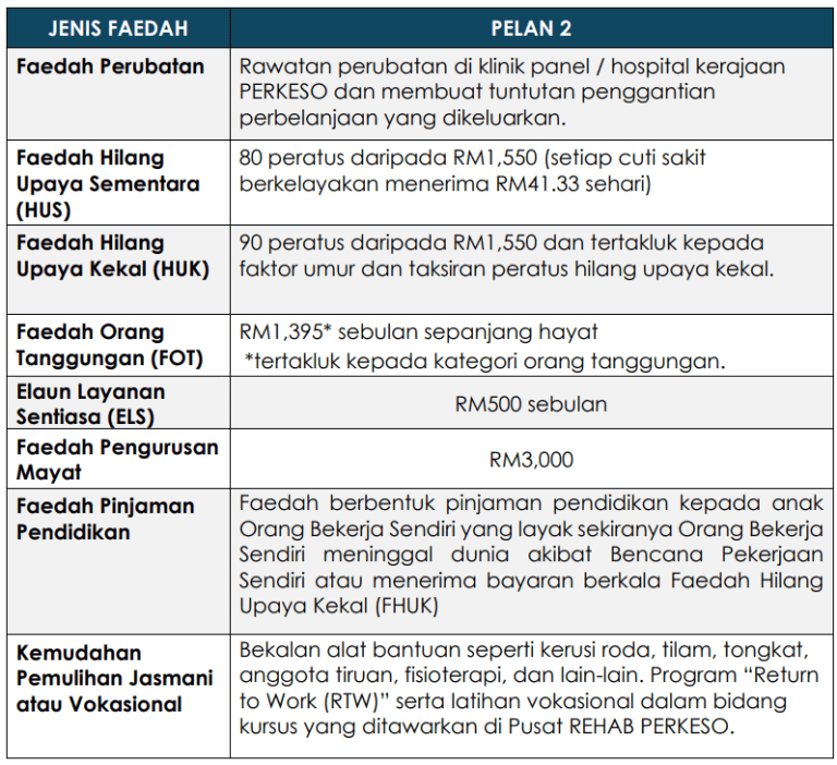 • Faedah Hilang Upaya Sementara (HUS) – RM41.33 sehari untuk cuti sakit layak.
