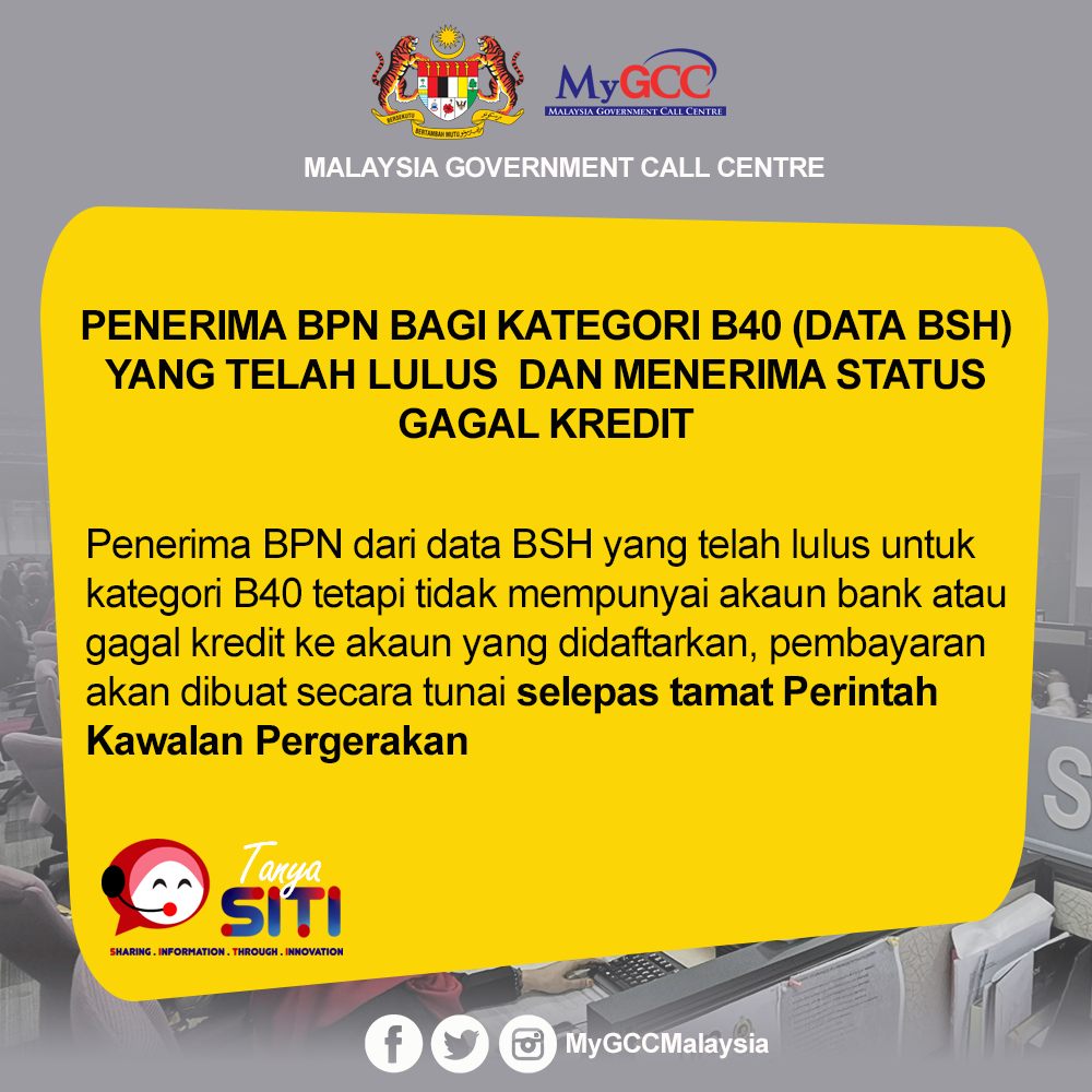 Untuk makluman semua pemohon BPN Hasil kategori B40 dari data BSH, sekiranya permohonan anda telah lulus tetapi tidak mempunyai akaun bank atau gagal kredit ke akaun yang didaftarkan. Anda akan menerima pembayaran secara tunai selepas tamat Perintah Kawalan Pergerakan (PKP) nanti.
