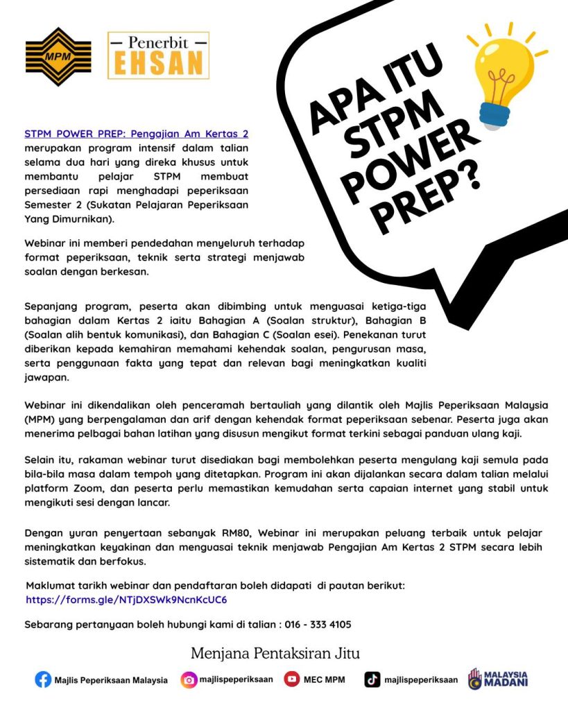 Program STPM Power Prep Pengajian Am Kertas 2 merupakan satu inisiatif penting yang memberi peluang kepada calon STPM untuk membuat persediaan lebih terarah dan berfokus.