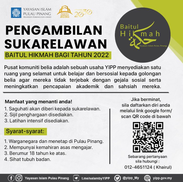 Oleh itu, Yayasan Islam Pulau Pinang memerlukan tenaga kerja sukarelawan untuk menjaga pusat komuniti belia ini bagi memastikan pengoperasian di Baitul Hikmah berjalan dengan lancar dan selamat.