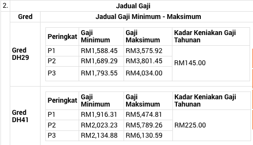 - ijazah sarjana muda kepujian dalam bidang berkaitan yang diiktiraf oleh kerajaan daripada institusi-institusi pengajian tinggi tempatan atau kelayakan yang diiktiraf setaraf dengannya (Gaji permulaan ialah pada Gred DH41:RM2,120.73); atau [Calon-calon di atas yang memiliki Diploma Pendidikan hendaklah dibayar satu tangga gaji lebih tinggi daripada gaji yang ditetapkan] (Gaji permulaan ialah pada Gred DH41:RM2,222.94); atau