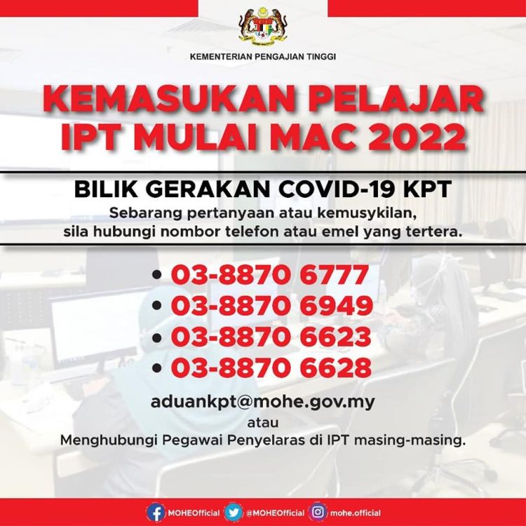 Para pelajar dan ibu bapa boleh menghubungi Bilik Gerakan Covid-19 KPT di talian 03-8870 6777/6949/ 6623/ 6628 melayari laman web IPT atau terus menghubungi Pegawai Penyelaras di IPT masing-masing sekiranya terdapat pertanyaan mengenai perkara ini.