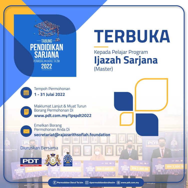 Permohonan Tabung Pendidikan Sarjana Permodalan Darul Ta’zim (PDT) kini dibuka! Tawaran bantuan kewangan kepada mereka yang sedang melanjutkan pelajaran di peringkat Ijazah Sarjana serta menepati syarat-syarat kelayakan yang telah ditetapkan.