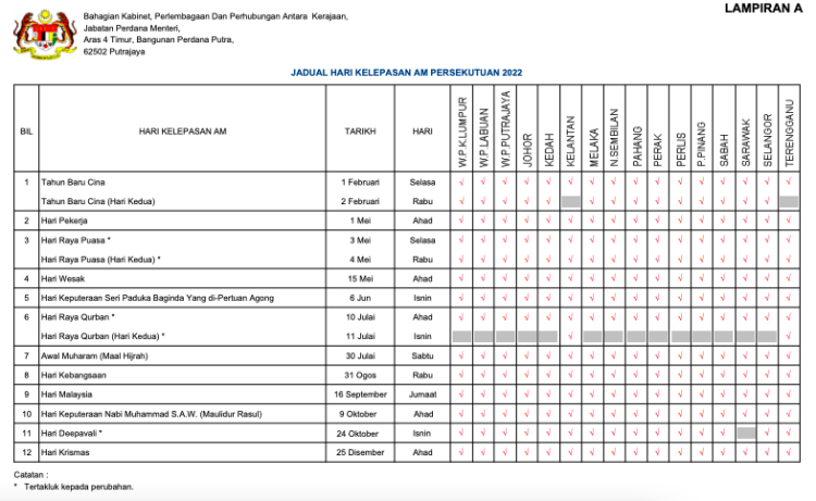 - 11 Julai 2022 (Isnin) – Semua Negeri kecuali Johor *Tertakluk kepada pindaan