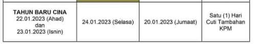 Tarikh Cuti Tahun Baru Cina 2023 & 1 Hari Cuti Sekolah Tambahan KPM