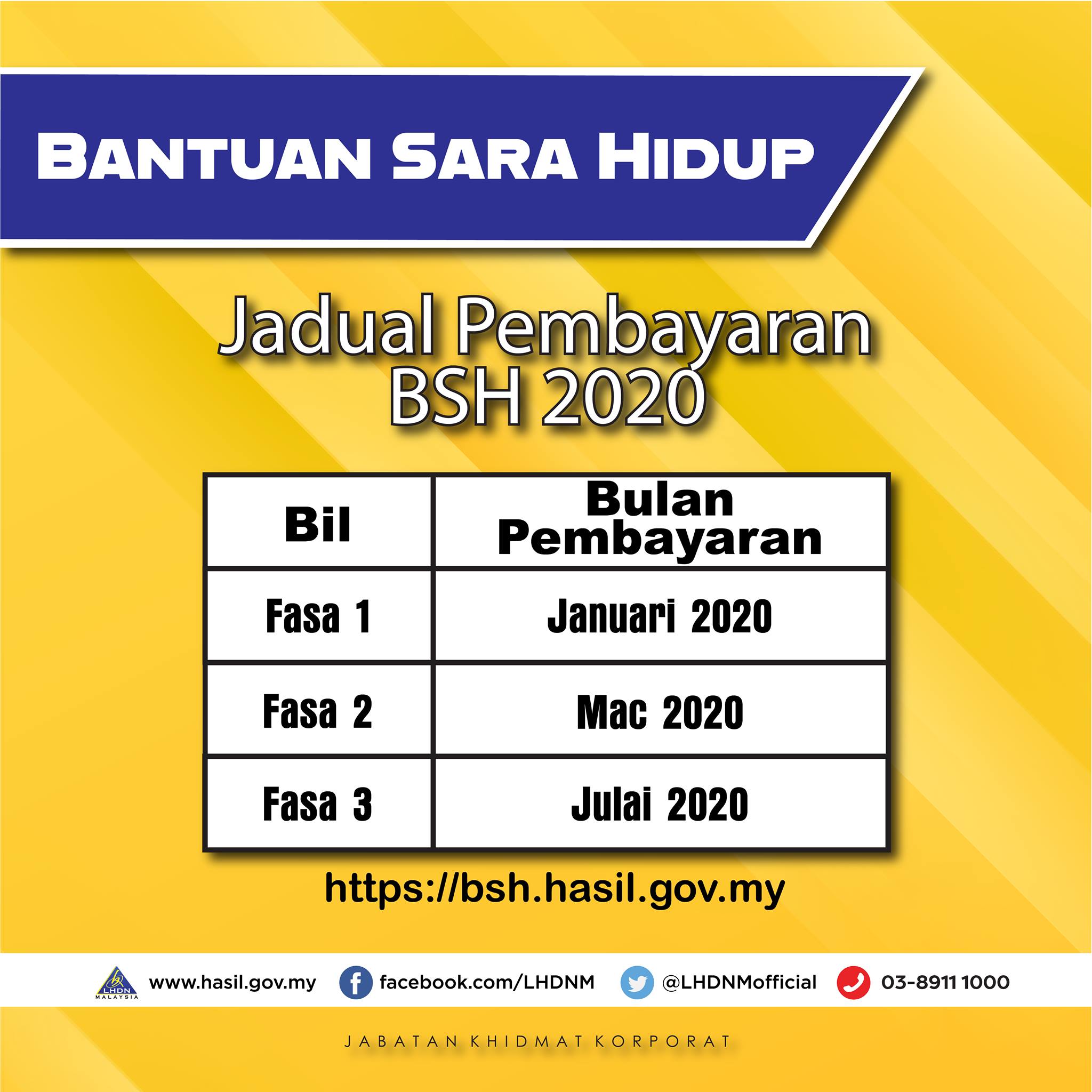 Akibat dari perintah PKP, Kaunter dan Talian Hotline BSH (1-800-88-2747) tidak beroperasi mulai 26 Mac 2020 berikutan arahan Perintah Kawalan Pergerakan (PKP). Oleh itu, pemohon digalakkan untuk mendapatkan maklumat BSH secara dalam talian melalui portal rasmi bsh.hasil.gov.my