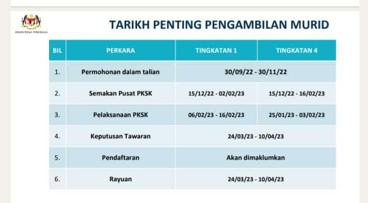 Tarikh Pelaksanaan PKSK & Kemasukan Ke MRSM/ SBP/ Sekolah Khusus 2023