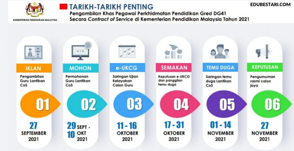 Berikut adalah tarikh-tarikh penting Pengambilan Khas Pegawai Perkhidmatan Pendidikan Gred DG41 yang calon perlu ambil perhatian: