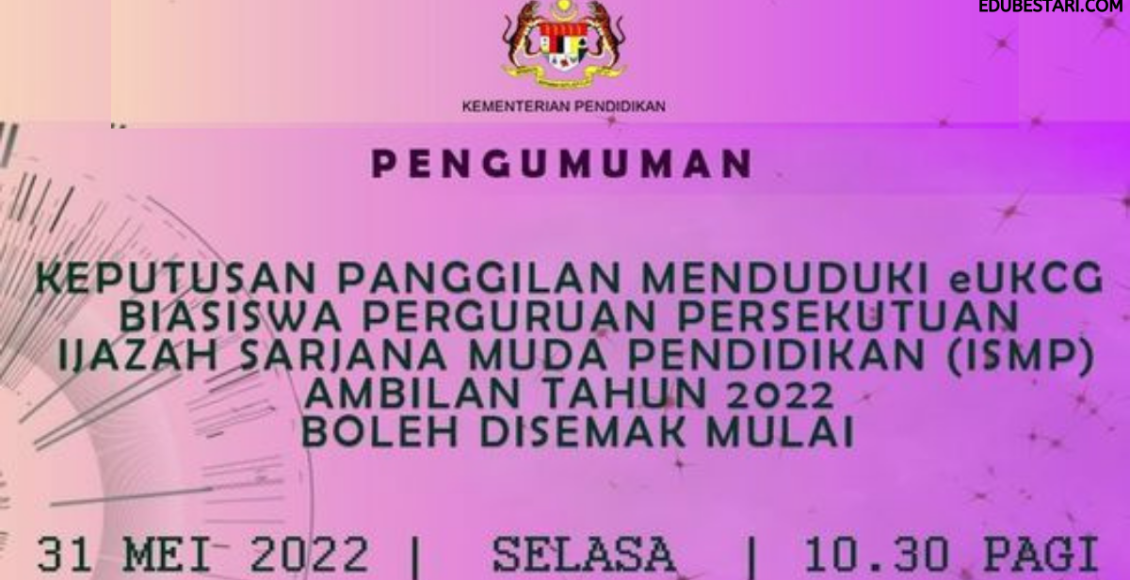 Permohonan secara dalam talian telah dibuka pada bulan Mac lepas. Kini individu yang telah membuat permohonan boleh buat semakan keputusan panggilan menduduki eUKCG Biasiswa Perguruan Persekutuan Ijazah Sarjana Muda Pendidikan (ISMP).