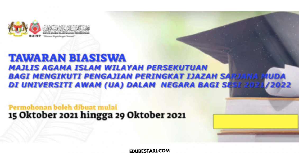 Permohonan adalah dipelawa kepada pelajar- pelajar yang telah mendapat tawaran untuk melanjutkan pengajian di peringkat Ijazah Sarjana Muda di Universiti Awam dalam negara yang terpilih ambilan sesi 2021/2022 untuk memohon biasiswa tajaan Majlis Agama Islam Wilayah Persekutuan (MAIWP).