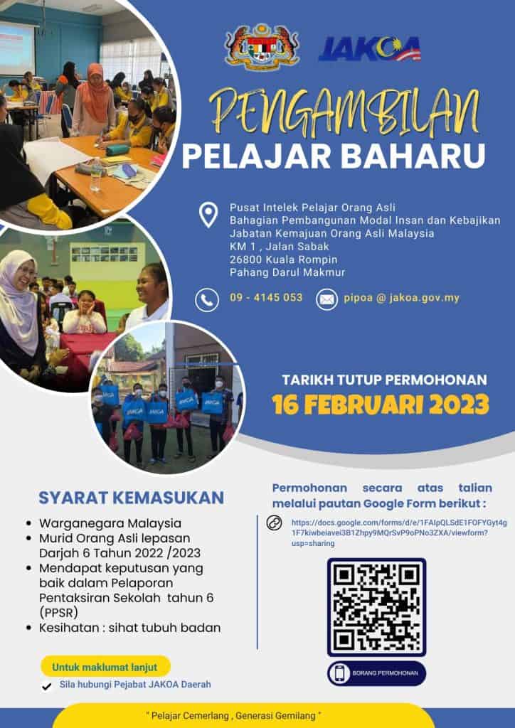 Tawaran permohonan kemasukan ke Pusat Intelek Pelajar Orang Asli (PIPOA) telah dibuka. Sila lengkapkan Borang Permohonan Kemasukan ke Pusat Intelek Pelajar Orang Asli (PIPOA) Tingkatan Satu Tahun 2023 Secara Atas Talian. Tarikh tutup permohonan iaitu pada 16 Februari 2023.