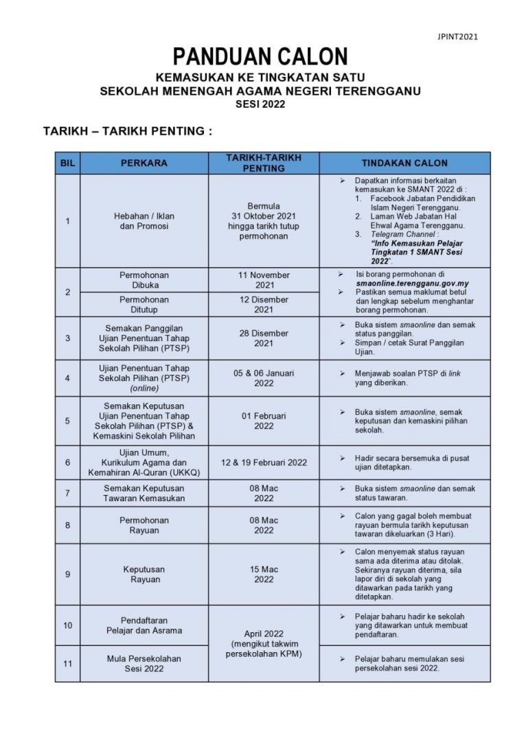 Berikut merupakan tarikh-tarikh penting permohonan SMANT: