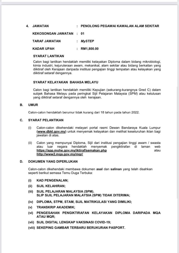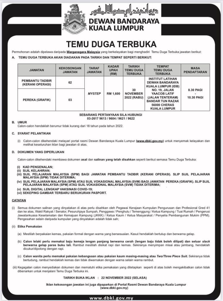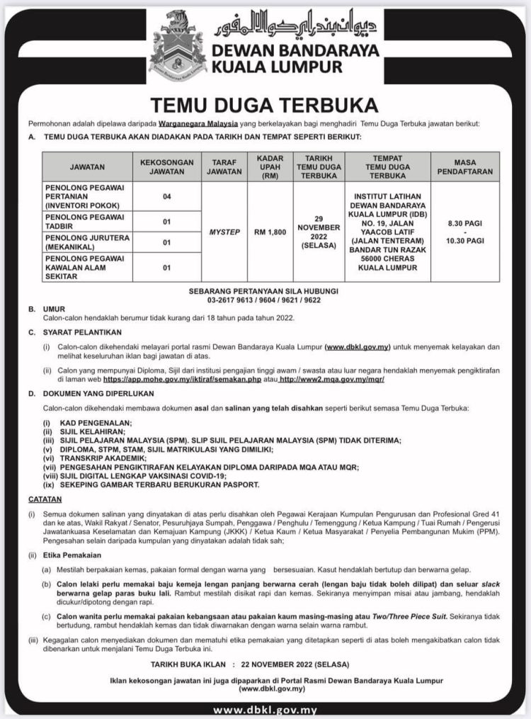 Berminat nak jadi salah seorang daripada anggota Dewan Bandaraya Kuala Lumpur (DBKL)? DBKL mempelawa warganegara Malaysia yang berkelayakan dan berminat untuk menghadiri Temuduga Terbuka bagi pengambilan MySTEP pelbagai jawatan seperti yang diiklankan.