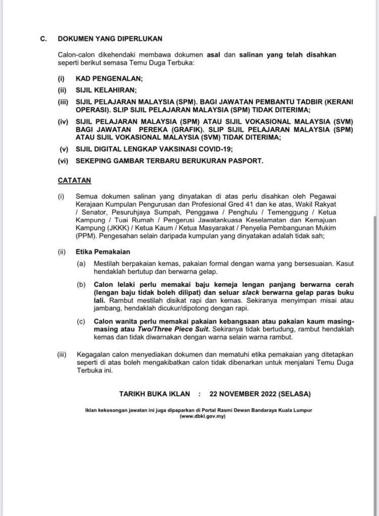 Bagi calon yang berminat dengan jawatan ditawarkan, anda boleh hadir ke lokasi dinyatakan pada 29 & 30 November 2022 dengan berpakaian mengikut panduan ditetapkan. Setiap calon mestilah hadir bersama dokumen-dokumen dinyatakan.