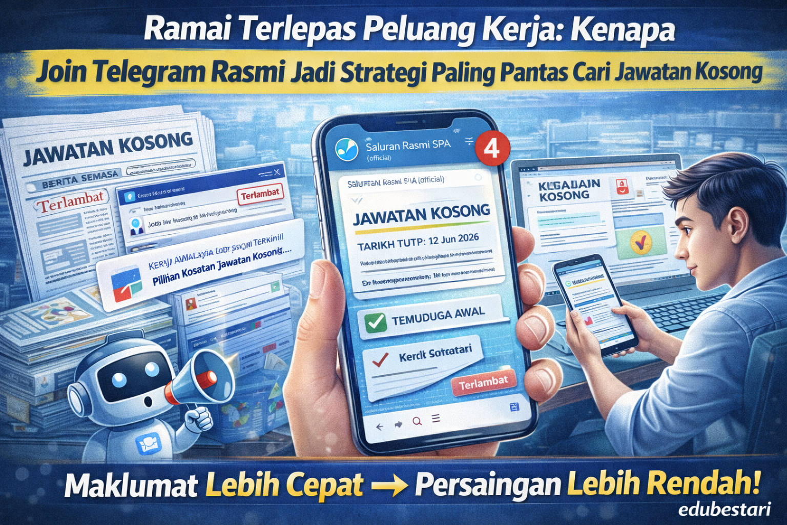 Dalam era digital hari ini, kaedah penyampaian maklumat telah berubah. Agensi kerajaan, SPA, serta komuniti kerjaya kini semakin aktif menggunakan Telegram sebagai saluran utama untuk menyampaikan maklumat jawatan kosong secara pantas dan terus kepada calon.