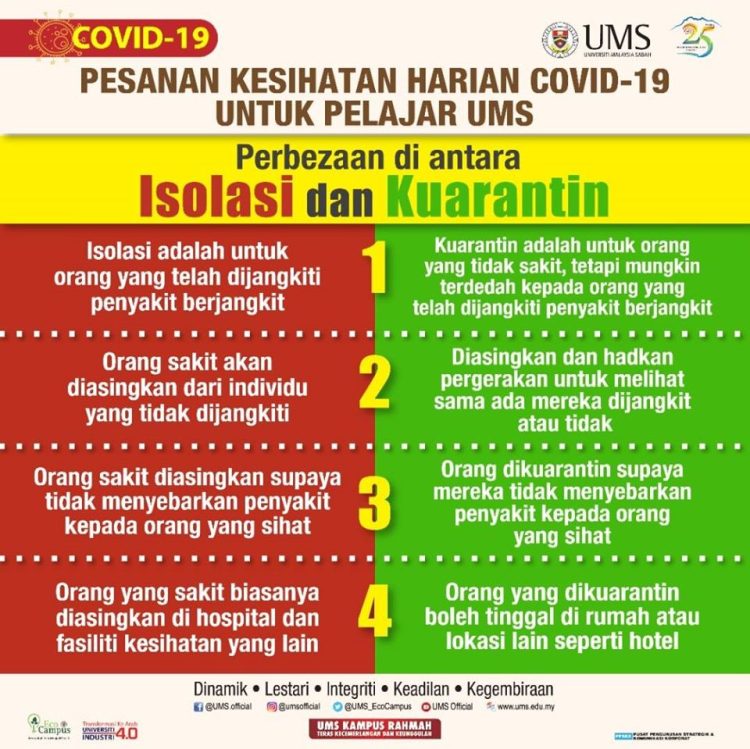 Jika anda perasan, pesakit kes Covid-19 perlu menjalani tempoh isolasi manakala kontak rapat perlu menjalani kuarantin. Apa perbezaan antara isolasi dan kuarantin?