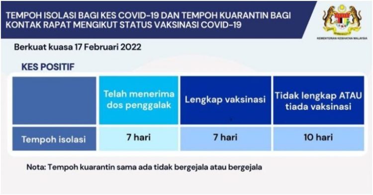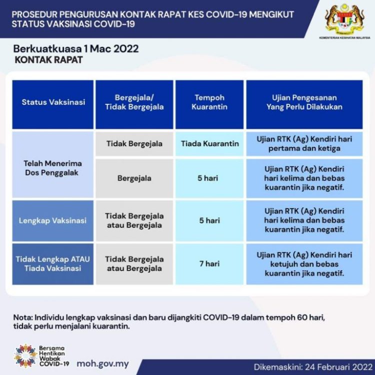 Berkuat kuasa mulai 1 Mac 2022, berikut adalah tempoh isolasi atau kuarantin bagi kes Covid-19 dan kontak rapat mengikut status vaksinasi masing-masing: