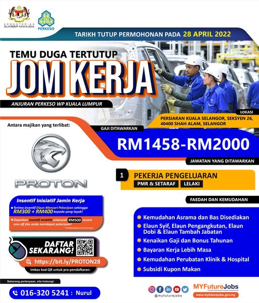 Perusahaan Otomobil Nasional Sdn Bhd (PROTON) sedang mencari lelaki warganegara Malaysia yang merupakan lepasan sekolah untuk hadir temuduga tertutup bagi memohon jawatan Pekerja Pengeluaran. Temuduga akan dilaksanakan melalui program Temuduga Tertutup Jom Kerja anjuran PERKESO WP Kuala Lumpur.