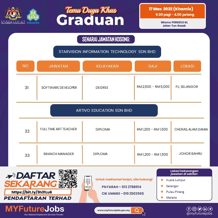 Pencari kerja yang berminat nak ikuti temuduga khas ini boleh buat pra-pendaftaran terlebih dahulu sebelum tarikh temuduga. Temuduga secara terbuka akan dilaksanakan pada 17 Mac 2022 bagi di lokasi yang ditetapkan.