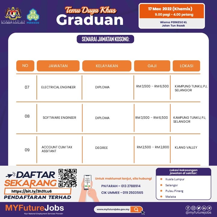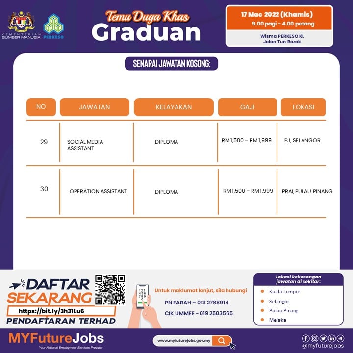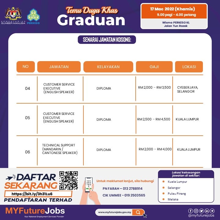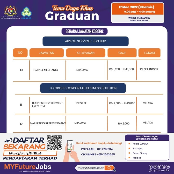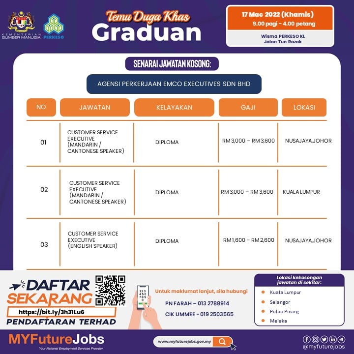 Panggilan buat para graduan yang masih menganggur dan berminat nak bekerja dalam pelbagai bidang! Kementerian Sumber Manusia dengan kerjasama Perkeso akan mengadakan temuduga khas melalui Temuduga Khas Graduan bagi membantu graduan mendapatkan peluang pekerjaan dan mengisi pelbagai kekosongan jawatan yang ditawarkan oleh pelbagai majikan.