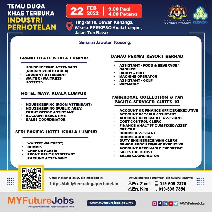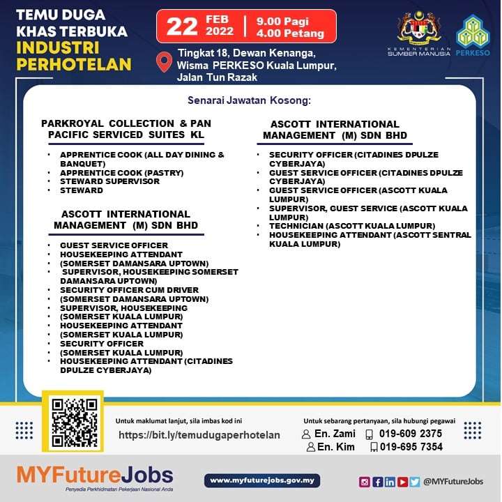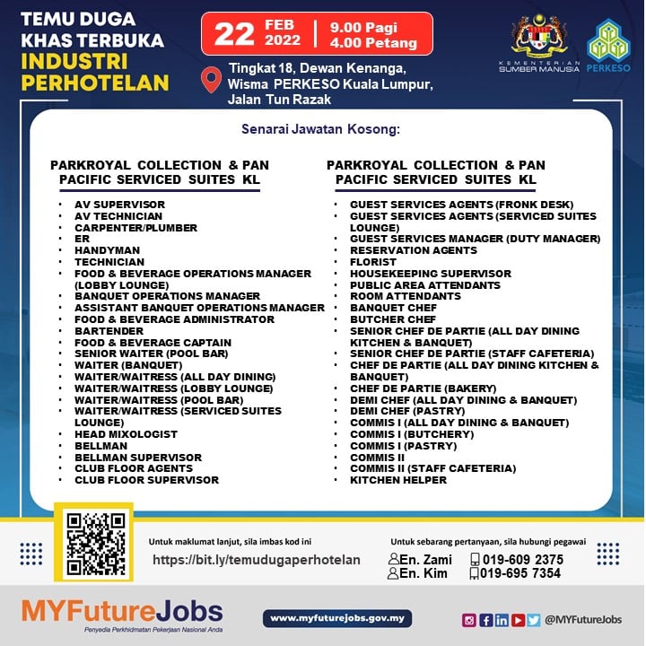 Panggilan buat para pencari kerja yang masih menganggur dan berminat nak bekerja dalam industri perhotelan! Kementerian Sumber Manusia dengan kerjasama Ibu Pejabat Perkeso SIP Putrajaya akan mengadakan temuduga khas industri perhotelan bagi membantu pencari kerja mendapatkan peluang pekerjaan dan mengisi pelbagai kekosongan jawatan yang ditawarkan oleh pelbagai majikan.