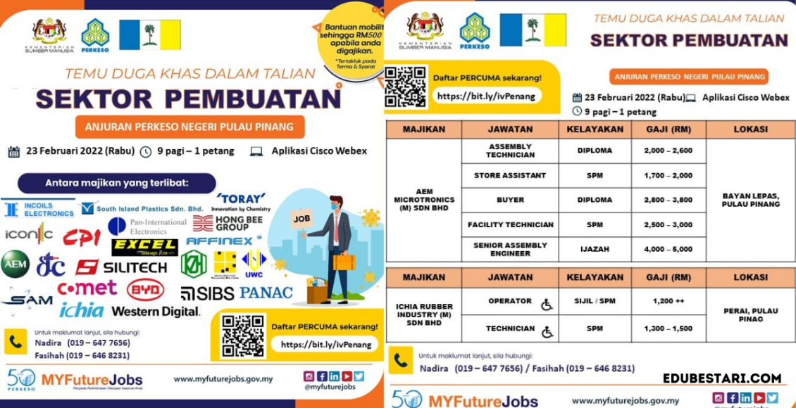 Pencari kerja yang berminat nak membina kerjaya dalam Sektor Pembuatan dan ingin sertai temuduga online ini boleh buat pendaftaran sebelum tarikh temuduga. Pelbagai peluang pekerjaan ditawarkan oleh pelbagai majikan syarikat terkemuka.