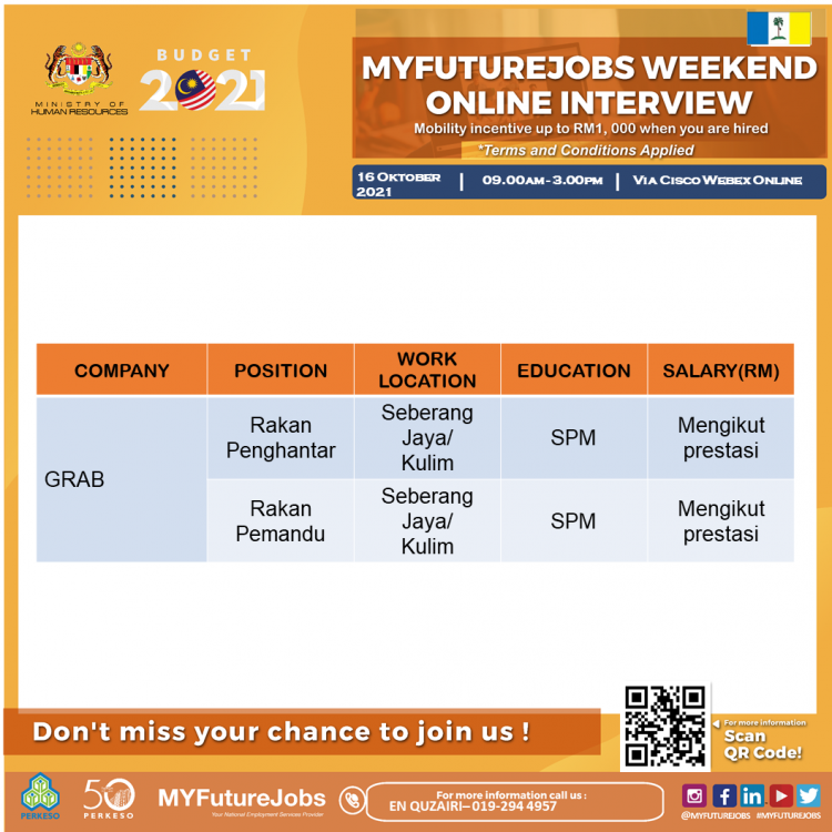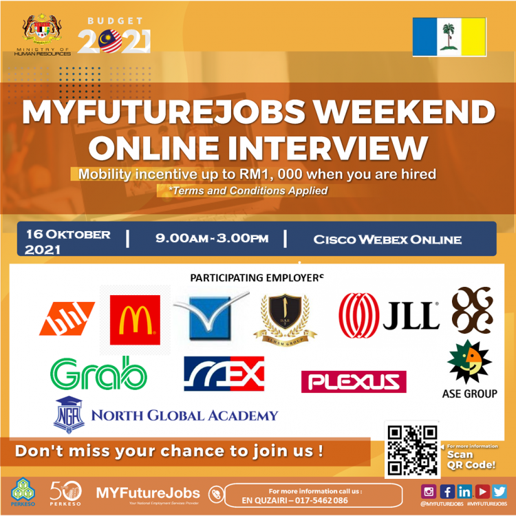 Berita baik buat pencari kerja di luar sana terutamanya graduan dan pekerja yang diberhentikan kerja! PERKESO Pulau Pinang akan mengadakan MyFutureJobs Weekend Online Interview pada 16 Oktober 2021 bermula jam 9.00 pagi hingga 3.00 petang.