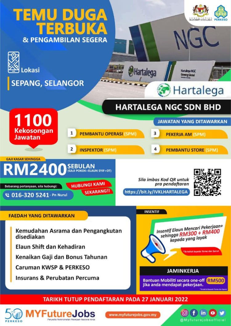 Anda ada kelayakan SPM dan sedang mencari peluang pekerjaan dengan pendapatan yang lumayan? Hartalega NGC SDN BHD kini mempelawa orang ramai dengan kelayakan SPM dan berumur 18 tahun ke atas ikuti temuduga terbuka yang akan diadakan di Sepang, Selangor.