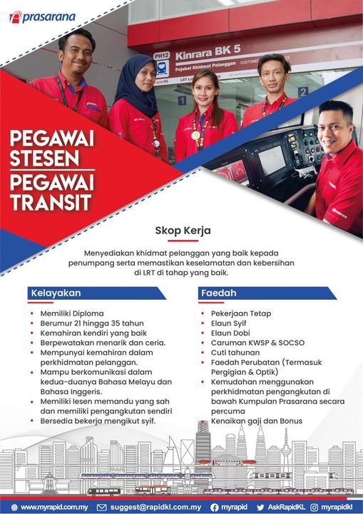 Anda berminat nak bina kerjaya bersama Prasarana? Prasarana akan mengadakan temuduga terbuka tidak lama lagi dengan menawarkan jawatan Juruteknik dan Pegawai Stesen buat warganegara Malaysia. Dengan kelayakan minima Diploma anda layak untuk mohon jawatan ditawarkan!