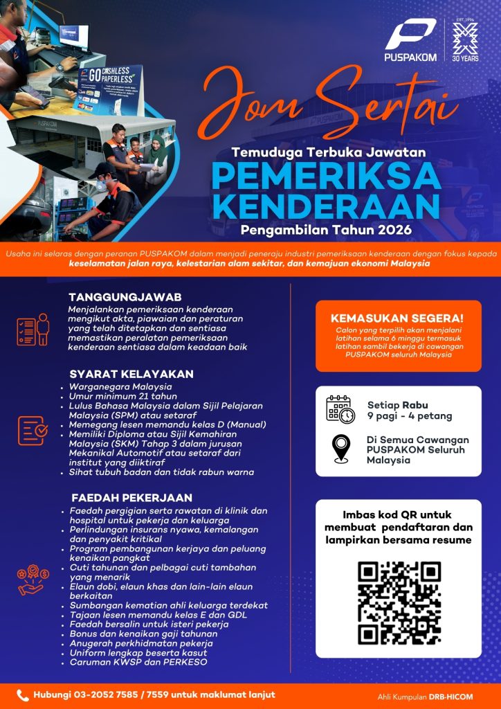 Temuduga terbuka bagi jawatan Pemeriksa Kenderaan PUSPAKOM tahun 2026 kini dibuka kepada warganegara Malaysia yang berkelayakan. Peluang ini sangat sesuai bagi calon yang mempunyai latar belakang automotif dan berminat membina kerjaya dalam industri pemeriksaan kenderaan.