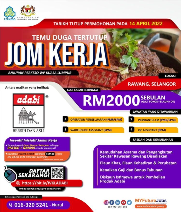 Peluang kerja kosong buat pencari kerja di seluruh Malaysia! PERKESO Wilayah Persekutuan Kuala Lumpur akan mengadakan Temuduga Tertutup Jom Kerja dengan penglibatan Adabi Consumer Industries Sdn Bhd. Pelbagai jenis jawatan ditawarkan buat pencari kerja yang ada kelayakan minima PMR atau SPM.