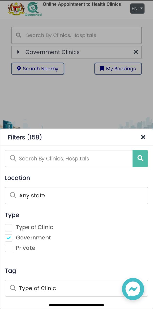 - Temujanji klinik boleh dibuat melalui mana-mana pilihan yang disediakan. Contohnya klik QueueMed