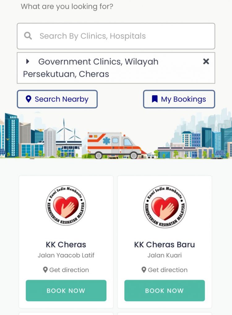 - Klik BOOK NOW pada pilihan Klinik Kesihatan berdekatan anda