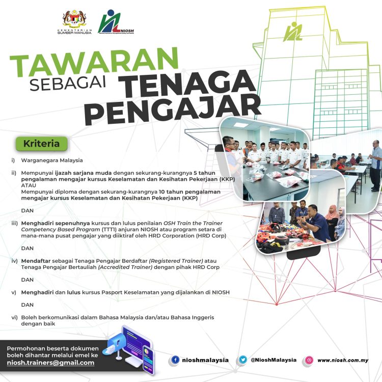 Semua warganegara Malaysia yang memenuhi kriteria dibawah adalah dipelawa untuk memohon menjadi tenaga pengajar bagi kursus-kursus anjuran NIOSH. Inisiatif ini adalah usaha bagi meramaikan lagi orang yang kompeten dan orang yang terlatih di dalam pelbagai disiplin Keselamatan dan Kesihatan Pekerjaan (KKP).